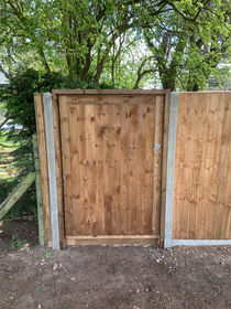 A Closeboard gate and panel fence with concrete slotted posts and gravel boards.